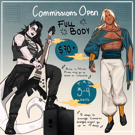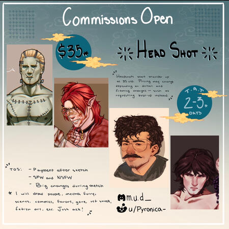Please browse at your discretion! Some examples include blood and NSFW art; if these make you uncomfortable or you are a minor, do not click on MATURE CONTENTWith a good set of instructions and some references, I can work on almost everything and I am willing to work on almost any sort of art!I reserve the right to decline any request if I see fit, or if I am uncomfortable with the requested piece.See prices here.